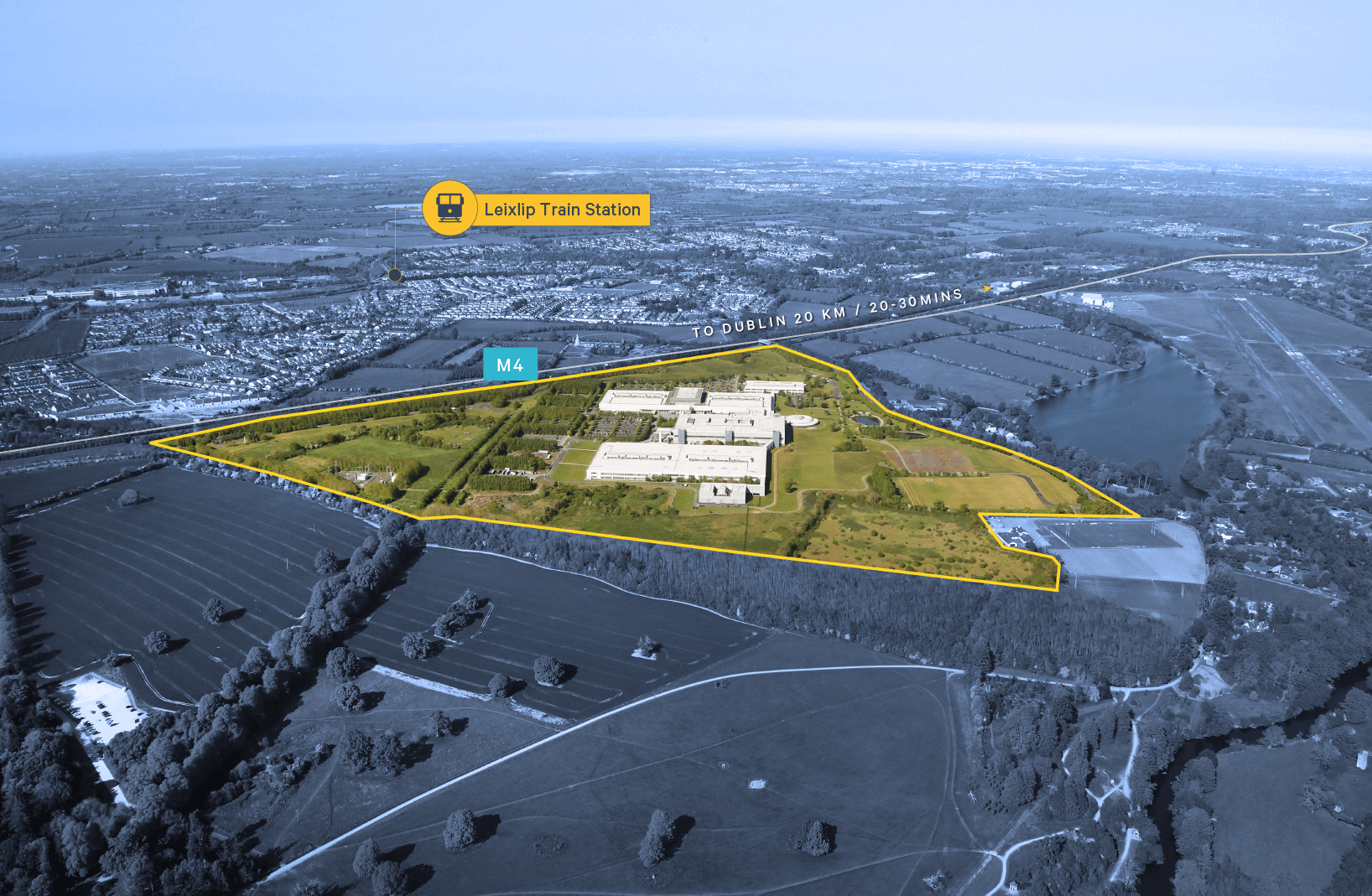 The overall business campus extends to approx. 194.5 acres, of which four separate land parcels to the north, west and southern boundaries comprising c. 70 acres are capable of further development. Under the Leixlip Local Area Plan 2017 – 2023, the lands are zoned objective H “Industrial & Warehousing”, that is to provide for industry, manufacturing, distribution and warehousing. Uses permitted in principle include Light Industry; Offices; Warehouse – Wholesale / Store / Depot.